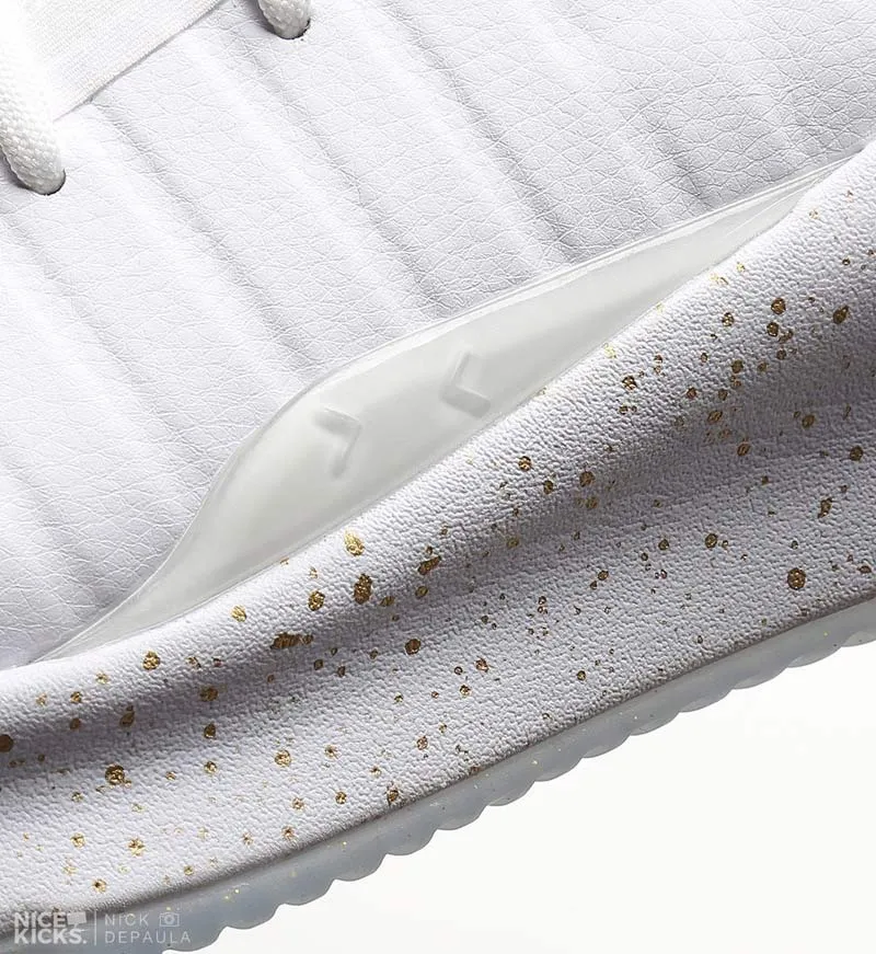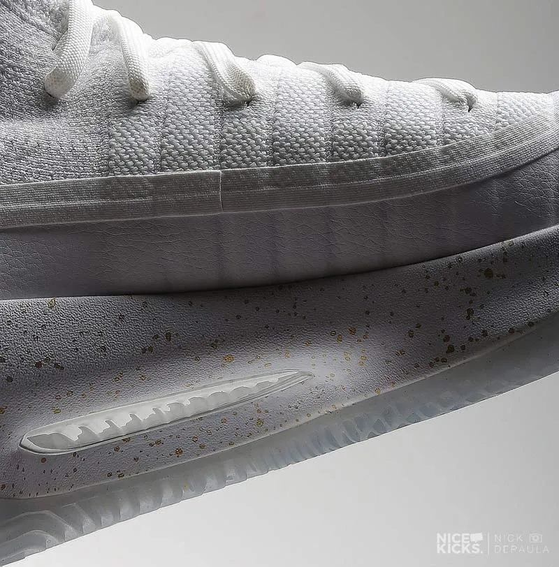 Mais Nick DePaula, journaliste pour Nice Kicks et Yahoo, a pu approcher la nouvelle chaussure du meneur des Warriors. L'occasion de prendre des clichés très détaillés de ce modèle qui se détache assez nettement de la Curry 3. Le col et le coup de pied sont composés d'un matériau tissé. Un peu plus bas, un cuir synthétique semble apporter de la rigidité pour bloquer le pied.
