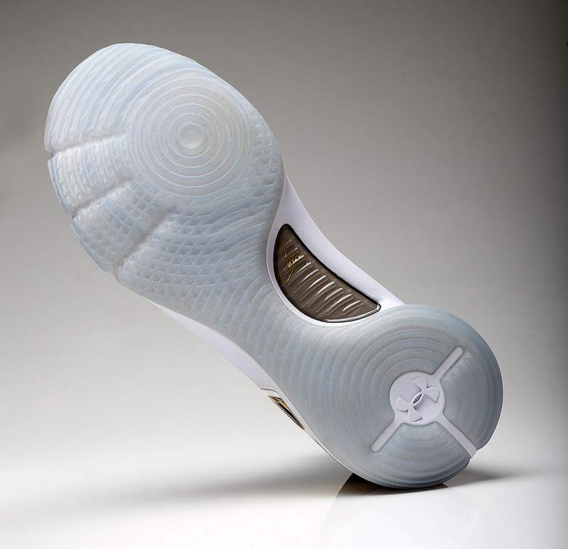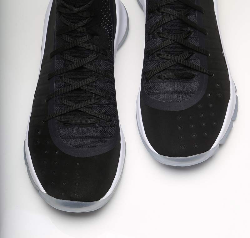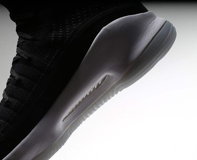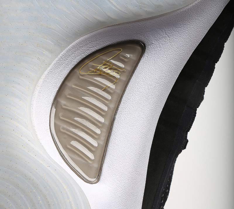 Mercredi soir, à Cleveland, le double MVP a chaussé un coloris noir de sa signature toute neuve. Comme sur la version blanche, la simplicité est de mise, avec quelques touches dorées et une semelle translucide pour parfaire l’ensemble. La tige mélange toujours le textile en haut et une matière plus solide pour bloquer le pied.