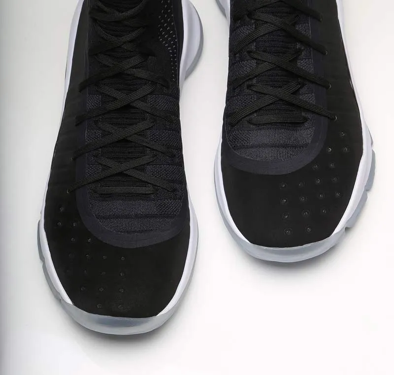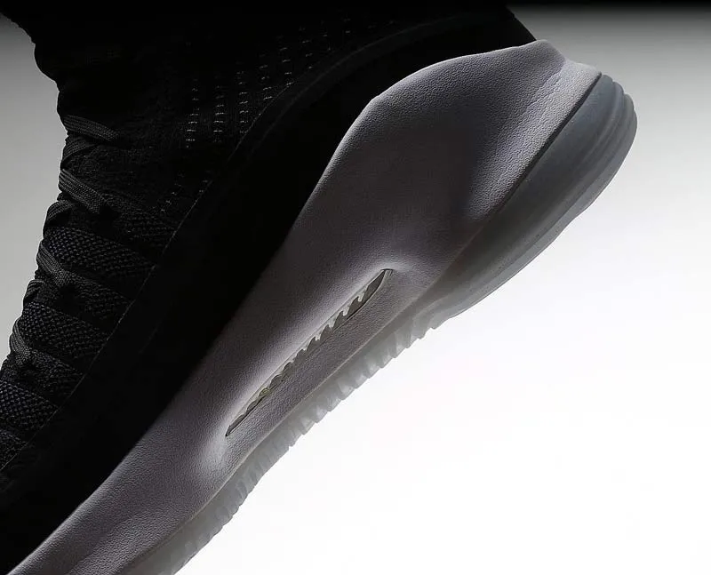Mercredi soir, à Cleveland, le double MVP a chaussé un coloris noir de sa signature toute neuve. Comme sur la version blanche, la simplicité est de mise, avec quelques touches dorées et une semelle translucide pour parfaire l'ensemble. La tige mélange toujours le textile en haut et une matière plus solide pour bloquer le pied.