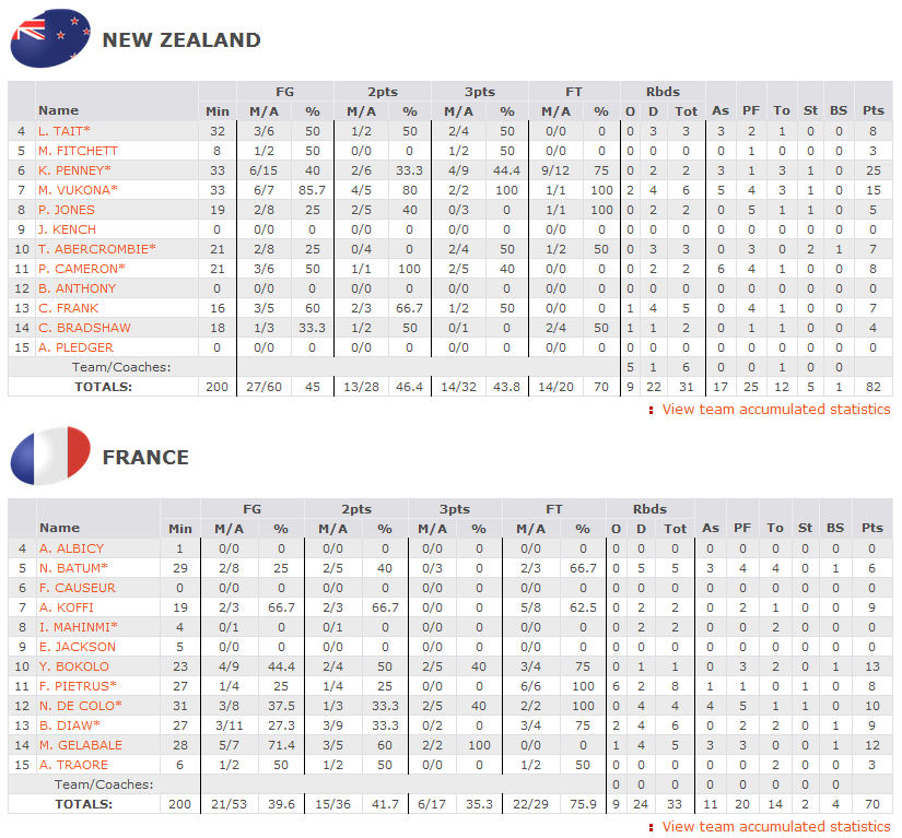 Egalement, la feuille de stats, histoire d’avoir la confirmation que les shooteurs “kiwis” ont eu tout le loisir de dégainer à longue distance. Autre stat qui tue : les deux interceptions de la France, symbole d’une équipe qui n’avait pas envie de défendre.