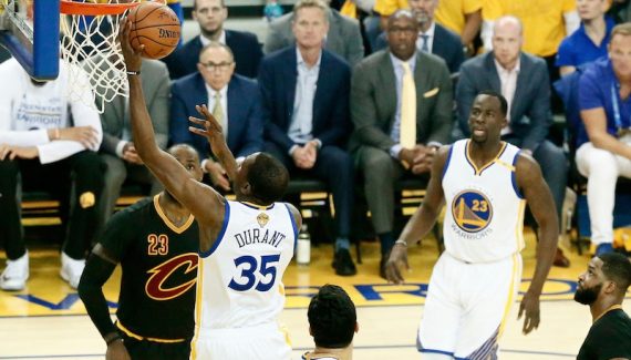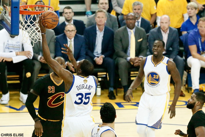 Mais LeBron James et les siens ne lâchent rien. Ils grignotent leur retard, et à l’entrée du money time, il n’y a plus que cinq points d’avance pour les Warriors. L’assassin devient moins silencieux. Il frappe fort. Encore à 3-points avec le défenseur bien collé à lui. Le tout avec une efficacité rare : 39 pts à 70% aux tirs, 63% à 3-points. C’est le Durant de Team USA, celui qui se promène dans le contexte FIBA. Sauf que là, c’est une finale NBA et qu’il y a LeBron James face à lui. Leur duel atteint des sommets.