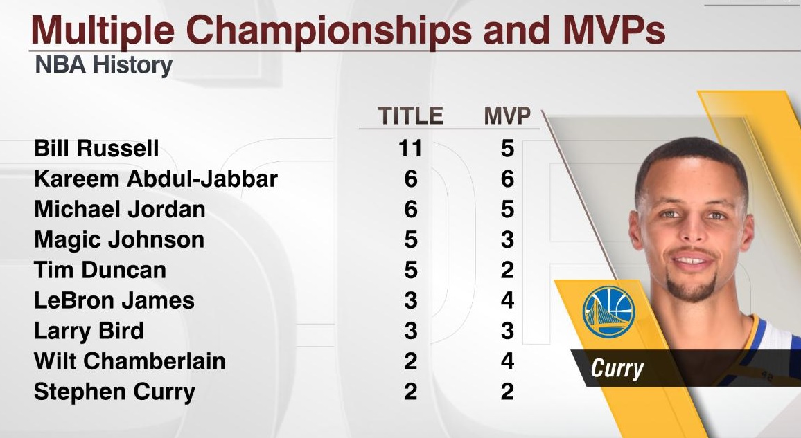 Avec son second titre en carrière, Stephen Curry entre dans le cercle fermé des joueurs plusieurs fois champion et MVP de la saison régulière. Ils ne sont que 9 désormais.