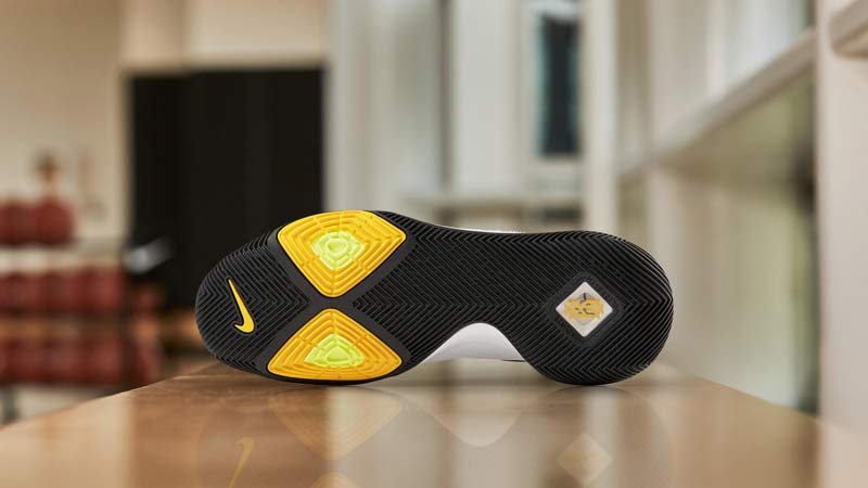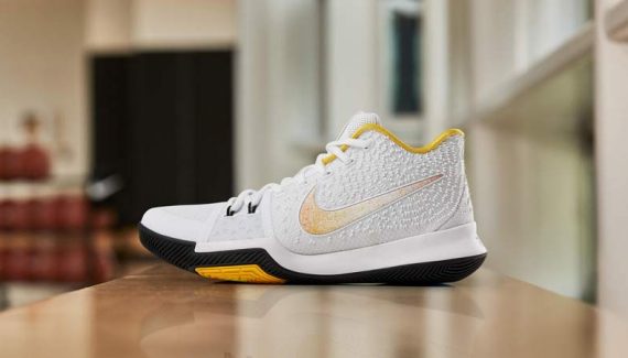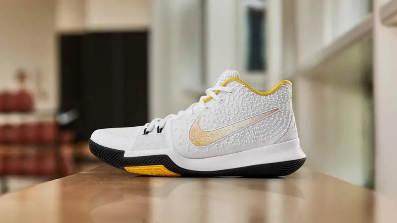 La Kyrie 3 est de la partie en 2017, avec un coloris blanc/noir/jaune très réussi.