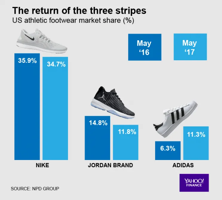 La marque aux trois bandes est de retour ! Selon les données compilées par le NPD Group, relayées par Yahoo, Adidas est en train de refaire son retard sur le marché américain des chaussures de sport. Nike est toujours le leader incontesté de cette catégorie avec 34.7% de parts de marché en mai dernier. Mais c’est en léger recul par rapport à mai 2016 (35.9%).