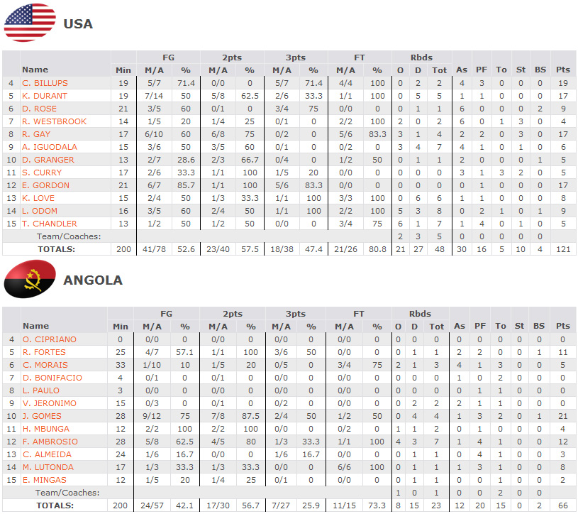 Après deux derniers matchs en roue libre et quelques jours de repos, l’équipe américaine rentrait dans la phase à élimination directe face à l’Angola, un adversaire très largement à sa portée. C’était donc avant tout une remise en route pour les américains qui se devaient de retrouver ce qui faisait leur force au début du tournoi : rythme effréné, mouvements en attaque et grosse pression sur le porteur de balle. C’est exactement ce qu’ils ont fait.