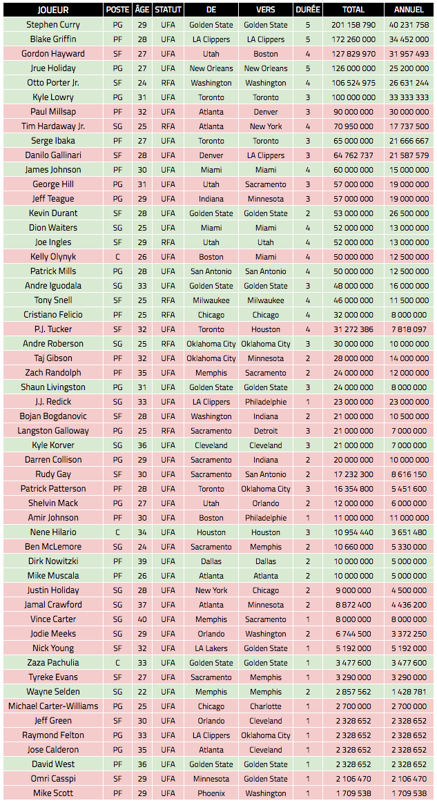 Si on fait le classement au niveau des postes de jeu, on constate d’ailleurs que ce sont les meneurs qui ont récupéré une grosse partie du pactole, avec 654.5 millions de dollars de contrats au total, dont une bonne part pour le seul Stephen Curry. Grâce à Blake Griffin ou Paul Millsap, les ailiers forts sont derrière avec 490.7 millions de dollars au total, alors que les ailiers complètement le podium avec 328 millions de dollars reçus par les franchises.
