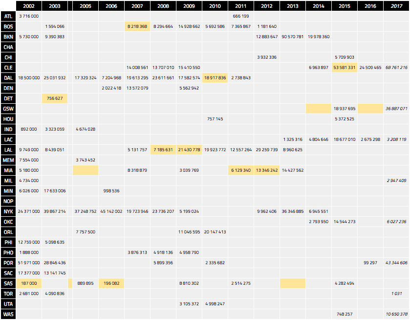 Malheureusement pour Dan Gilbert, son équipe n’a pas gagné le titre cette saison et il devra pourtant signer un chèque encore très conséquent d’environ 24.8 millions de dollars. C’est moins que l’an passé et cela s’explique par la hausse bienvenue du salary cap à 94.1 millions de dollars.