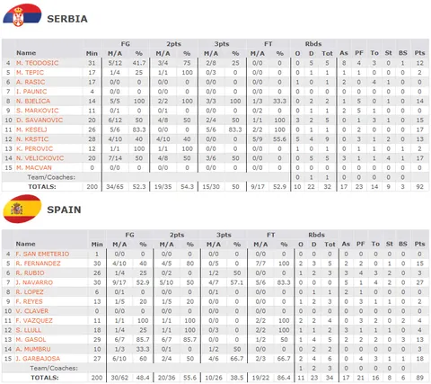 Nikola Velickovic, vexé d'une saison gâchée au Real Madrid, avait des comptes à régler avec l'équipe espagnole. Il démarrait donc le match tambour battant, prenait de vitesse le très lent Garbajosa et scorait. Sans interruption. Dans son sillage, les serbes prenaient les devants, portés par une énorme adresse à 3 points.