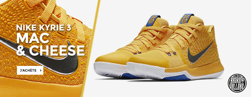 Commandez chez B4B la Nike Kyrie 3 Mac and Cheese inspirée de l’un des plats préférés de Kyrie et exclusivement réservées aux enfants et petits pieds.