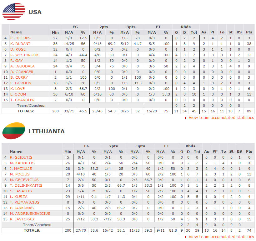On notera que Coach K. a joué une bonne partie du deuxième quart-temps avec trois petits ensemble : Westbrook (auteur d’un contre énorme), Gordon et l’infatigable Billups. Côté Lituanien, Javtokas (air-ball sur un lancer…) a de bonnes positions et il gêne les Américains mais il est maladroit près du cercle.
