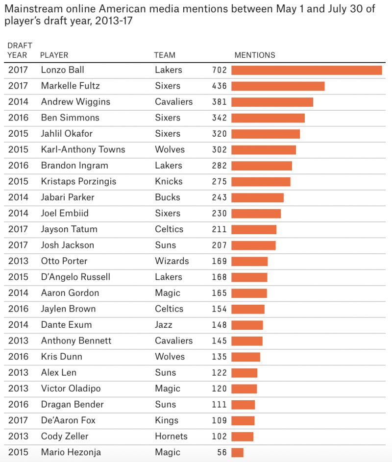 Lonzo Ball n’a pas encore joué un seul match en NBA qu’il est déjà hyper médiatisé. Sur Internet, il est même le rookie dont le nom revient le plus souvent dans la presse généraliste, selon une étude de de FiveThirtyEight.com portant sur ces cinq dernières années.