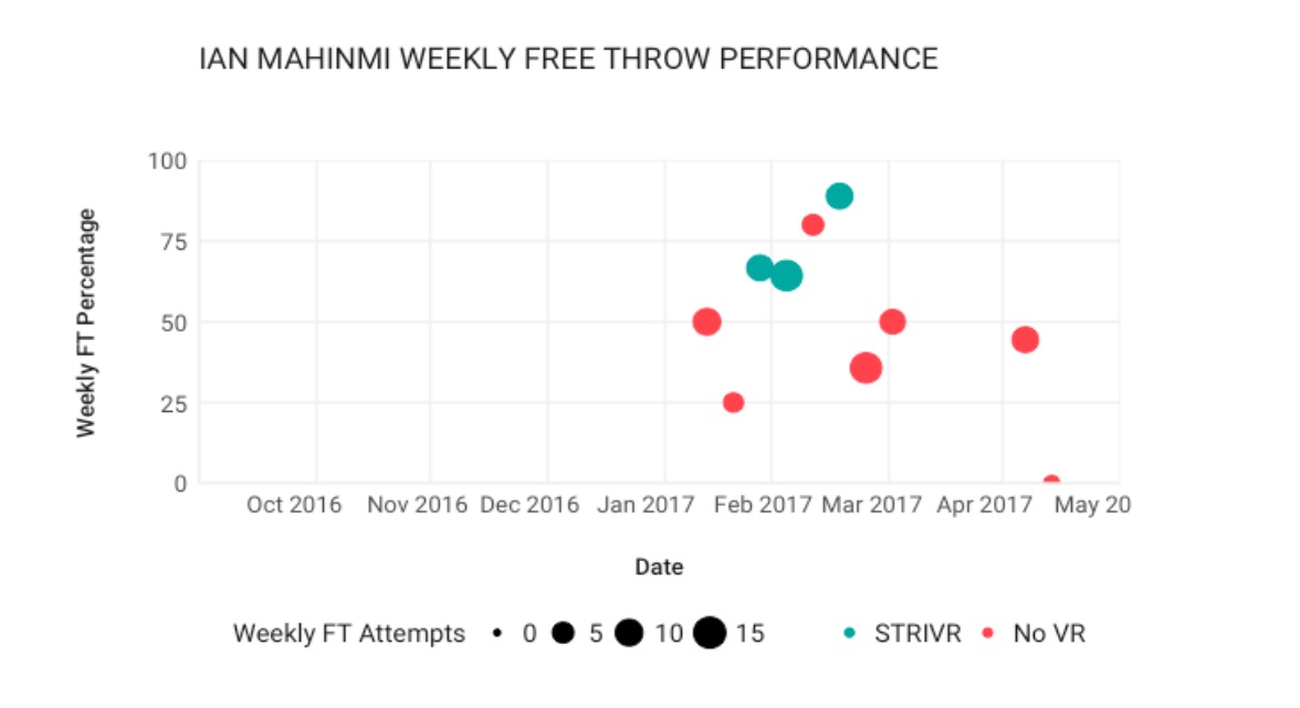 Dans un rapport publié sur son site Internet, STRIVR explique ainsi que le Français, longtemps blessé, a utilisé leur dispositif pendant 3 semaines. Durant cette période, son adresse aux lancers-francs était en moyenne de 73%. Le reste du temps, sans l’aide du casque, son pourcentage était retombé à 42%. Même si le fabricant reconnaît que l’échantillon est faible, le diagramme ci-dessous parle de lui-même.