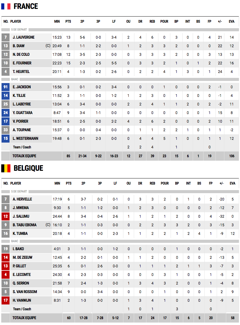 Après la grosse défaite face à la Lituanie, la France se devait de réagir face à la Belgique. Vainqueurs 85-60, les Bleus ont joué ce match en diesel mais ce retard à l’allumage n’a pas eu de conséquence. Avec 13 points et 6 rebonds, Joffrey Lauvergne s’est montré sous son meilleur jour, bien aidé par Nando De Colo (12 pts, 3 rbds, 3 pds en 17 min) et Evan Fournier (15 pts, 3 rbds). Pas loin de l’évaluation parfaite, Boris Diaw a servi d’étincelle salvatrice (8 pts à 3/3).