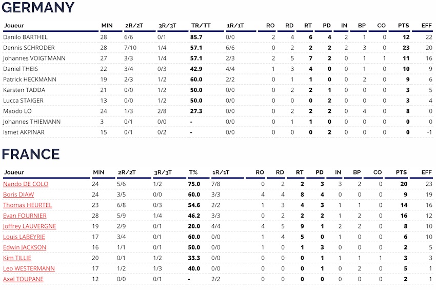 Que dire de la première mi-temps des Bleus ? Peut-être que c’est la plus aboutie sur le plan offensif. Après avoir encaissé un 6-0 d’entrée, les coéquipiers de Nando de Colo vont dérouler leur jeu, profitant des oublis défensifs allemands sur la ligne de fond. Heurtel, Fournier, Diaw… Tout le monde en profite, et les Bleus collent un 8-0 pour mener 14-9. De l’autre côté du terrain, c’est tout juste moyen avec des oublis à 3-points, mais la France est sur un nuage en attaque. Le trio Heurtel-Fournier-De Colo continue d’appuyer là où ça fait mal : dans le dos des défenseurs, sur la ligne de fond. C’est le meneur du CSKA qui conclut ce beau 1er quart-temps avec un shoot au buzzer. La France mène de 6 points (26-20) avec un 12 sur 16 aux tirs !