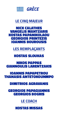 Malgré l’absence du “Greek Freak”, la Grèce dispose d’un effectif solide, avec des joueurs principalement issus des deux clubs phares du pays, le Panathinaikos et l’Olympiakos. Autour de son trio Nick Calathes – Ioannis Bourousis – Georgios Printezis, le coach Kostas Missas dispose en plus de la génération qu’il a portée au titre européen U20 en 2009 (Vangélis Mantzaris, Kostas Sloukas, Kostas Papanikolaou, Nikos Pappas…).