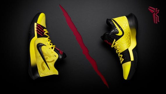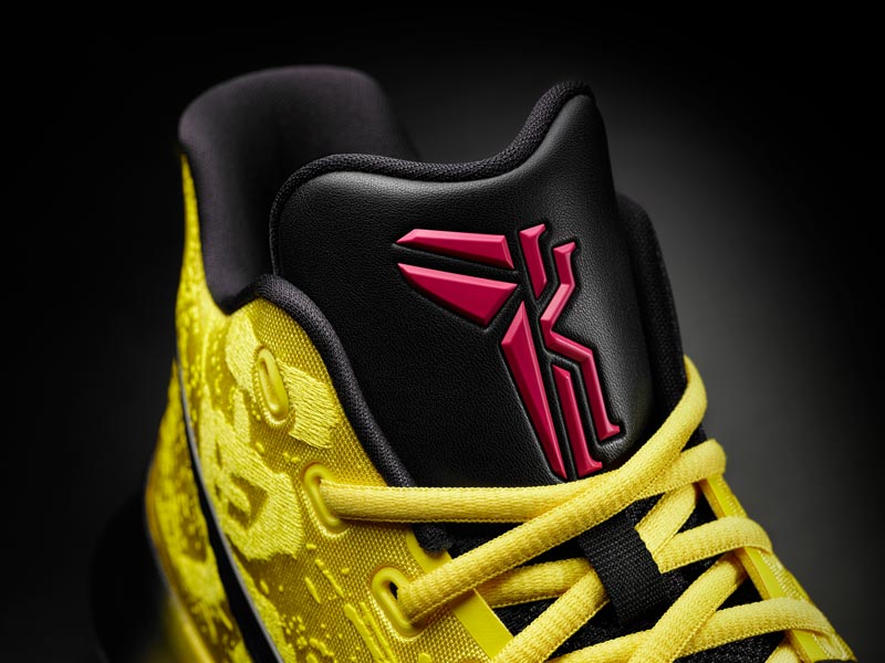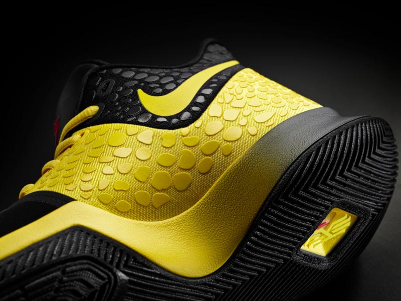 Ce superbe coloris reprend largement l’ambiance de celui qui avait été plaqué sur la Kobe 5. Mais il intègre désormais des références à la fois à Bruce Lee et à Kobe Bryant. Le logo du Black Mamba vient manger la moitié de celui d’Irving sur la languette. La texture “peau de serpent” sur l’intérieur du pied est un autre clin d’œil à l’ancienne star des Lakers.