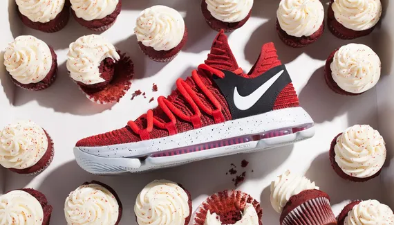 Jeu, set et match pour Kevin Durant qui met fin au feuilleton “cupcake” en utilisant la célèbre patisserie pour faire la promo' de son dernier modèle, la KD10 “Red Velvet”. Ce superbe modèle aux teintes rouge et noire est présenté au milieu de cupcakes, et c'est bien évidemment une allusion à la métaphore utilisée par Russell Westbrook pour critiquer le départ de Durant aux Warriors.