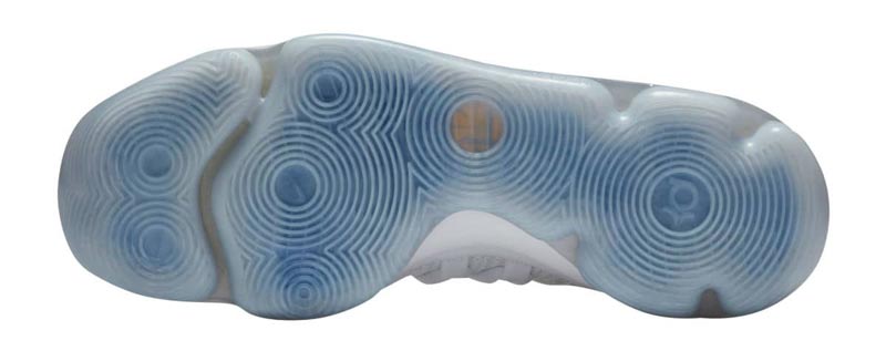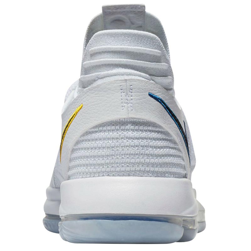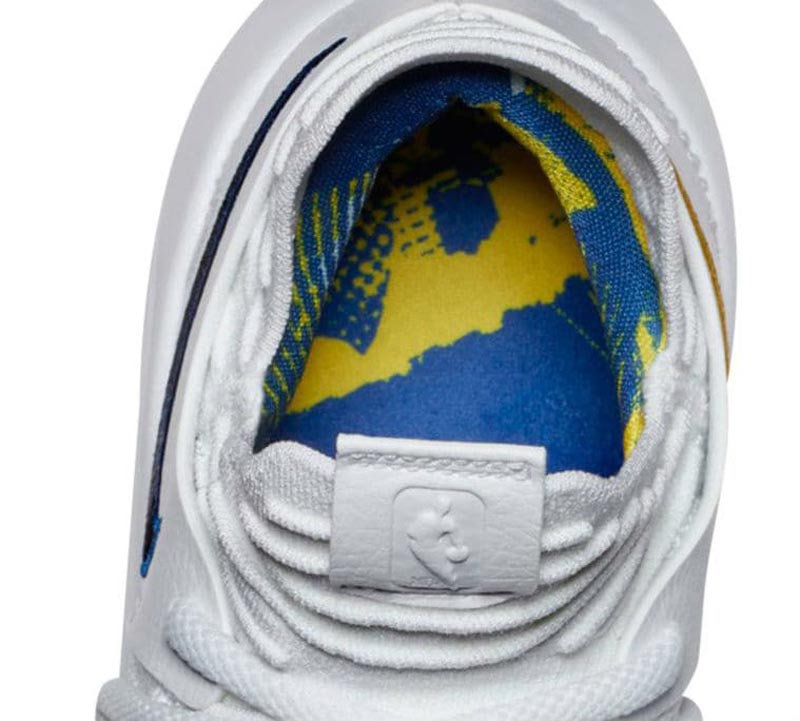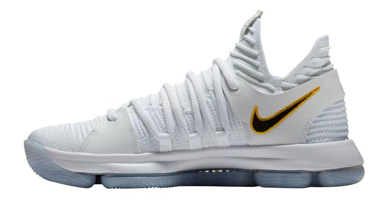 Sur le coloris “Opening Night” de la KD10, la silhouette de Jerry West est discrètement placée sur le bout de la languette. La teinte est très simple dans son ensemble, avec simplement les couleurs des Warriors placées sur la virgule de Nike. Ces couleurs sont bien plus présentes sur la doublure intérieure et la semelle.