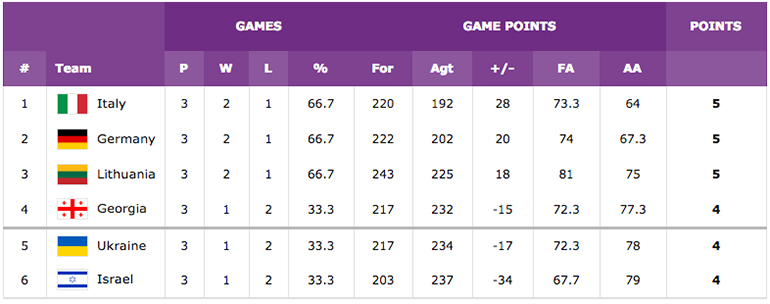 Dans le groupe B, par contre, c’est le chaos. Avec l’Ukraine qui fait tomber la Géorgie, la Lituanie qui s’offre l’Italie et Israël qui réussit le hold-up face à l’Allemagne, tous les scénarios sont encore possibles pour la suite.