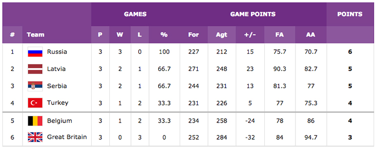 Dans le groupe D, la Russie engrange encore une victoire face à la Belgique alors que la Lettonie et la Serbie suivent derrière.