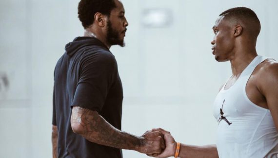 Après LeBron James et Kevin Durant, ou ses coéquipiers Frank Ntilikina et Tim Hardaway Jr., c’est Russell Westbrook qui est venu s’entraîner avec Melo. De passage dans le coin lui aussi, Brandon Jennings a dû se coltiner le MVP en titre en défense, tandis qu’on aperçoit aussi Enes Kanter.