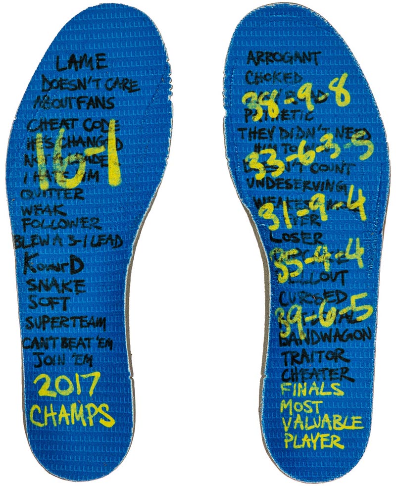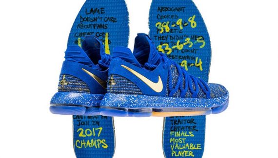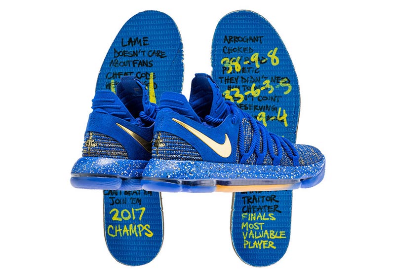 Pour ne pas les oublier, Nike les a listées sur la semelle du nouveau coloris Finals de la KD X. Mais par-dessus ces mots, l’ailier a surtout ajouté le bilan des Warriors en playoffs, le titre de champion, celui de MVP des Finals, et quelques statistiques monstrueuses.