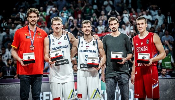 Il est accompagné dans le cinq majeur de la compétition par son coéquipier slovène Luka Doncic (14.3 points, 8.1 rebonds et 3.6 passes), blessé à la cheville et qu’il a dû aider à aller récupérer sa récompense, dans un très joli moment. Le russe Alexey Shved (24.3 points, 2.6 rebonds et 5.9 passes), le serbe Bogdan Bogdanovic (20.4 points, 3.6 rebonds et 5 passes) et l’espagnol Pau Gasol (17.4 points, 7.8 rebonds et 2.6 passes) complètent cet effectif de prestige.