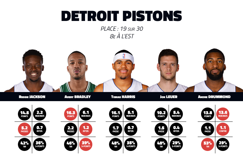 Le cinq est solide et complémentaire, et Avery Bradley est bien le joueur qu’il manquait aux Pistons. L’équipe n’a pas encore le niveau du Top 4 de sa conférence mais sa défense et ses qualités athlétiques lui permettent de s’installer dans le Top 8. Son expérience est supérieure à celle des Sixers, et sa régularité lui permet de faire le trou avec le Magic et les Knicks. Une saison sans grand éclat mais on retrouve la combativité d’il y a deux ans, et le duo Jackson-Drummond, revanchard, est enfin sur la même longueur d’ondes.