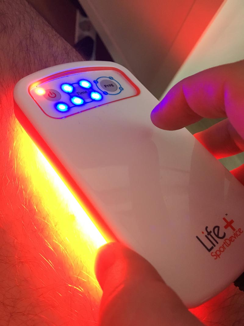 En mode “entretien musculaire“, on le pose sur le haut de la jambe, une zone pas totalement remise d’une pubalgie. Une petite douleur se fait ressentir dans les heures qui suivent. Au téléphone, un des créateurs du Life+ nous explique que la lumière stimule aussi le processus de réparation du muscle. C’est donc une douleur positive, car ça “travaille.” Effectivement, la douleur finit bien par disparaître. Deux jours plus tard, sur le terrain, pas de soucis.