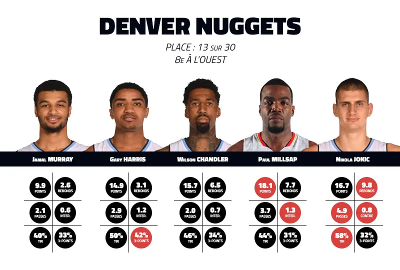 Paul Millsap s’intègre parfaitement dans le collectif, Nikola Jokic brille comme jamais, et la paire rappelle les plus belles heures du duo Millsap – Horford à Atlanta. La profusion chez les intérieurs et la profondeur chez les meneurs offrent de nombreuses possibilités à Michael Malone. De quoi compenser la perte des shooteurs et une adresse à 3-points en baisse. Denver surfe sur ses promesses de la saison passée et s'impose comme l'équipe que personne ne veut affronter. Dominatrice face aux équipes du ventre mou, elle accroche également les gros calibres. Les Nuggets se rapprochent des 50 succès et valident un billet pour les playoffs. Une première depuis 2013.