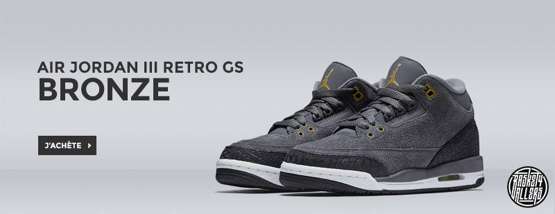 Commandez chez B4B la Air Jordan 3 GS Bronze dont les sobres tonalités grises et noires sont réhaussées d’une touche de bronze pour un résultat des plus sobres.