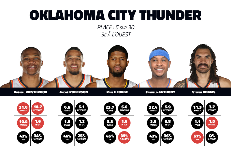 Le nouveau “Big Three” d’OKC tient toutes ses promesses, et ça fait très mal. Les trois compères s’entendent parfaitement avec un duo Russell Westbrook – Paul George létal sur jeu rapide et un Carmelo Anthony qui punit les défenses par son shoot extérieur. Difficile de contenir les trois hommes en même temps, et les victoires s’accumulent.
