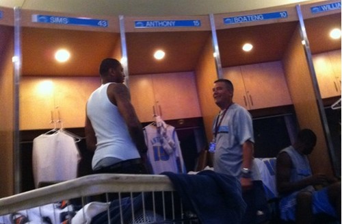 Fin du suspense à Denver avec le traditionnal “media day” avec un Carmelo Anthony en chair et en os ! Il était là, à discuter avec ses coéquipiers (la photo est de JR Smith), et il a accepté de répondre aux questions des journalistes sur les rumeurs de son transfert.