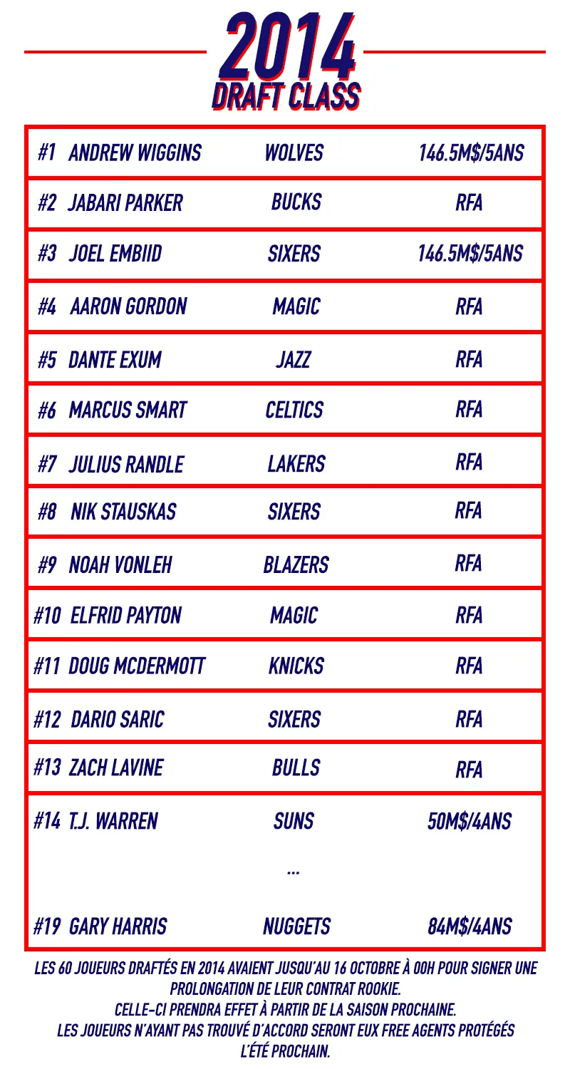 L'an passé, huit joueurs draftés en 2013 avaient paraphé une prolongation avant la deadline : Victor Oladipo, Cody Zeller, C.J. McCollum, Steven Adams, Giannis Antetokounmpo, Dennis Schroder, Gorgui Dieng et enfin Rudy Gobert.