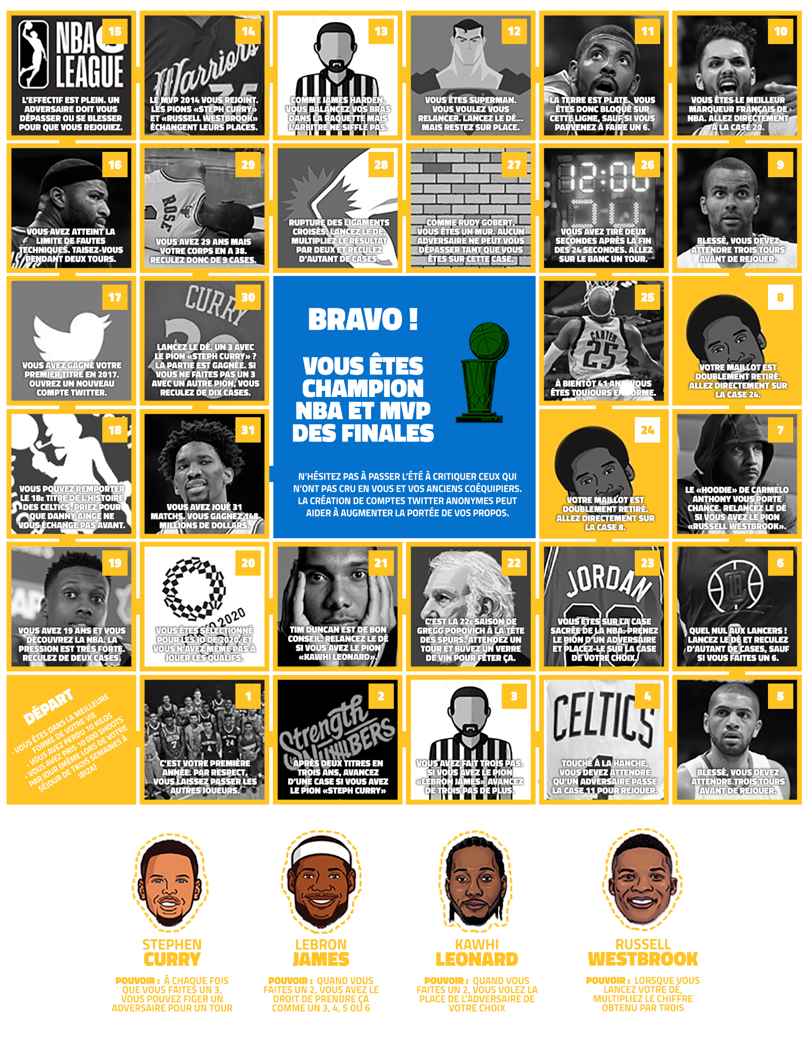 Outre notre guide de la saison, équipe par équipe, ou encore nos prédictions pour le meilleur rookie, le meilleur entraîneur ou le meilleur sixième homme, nous vous proposons un petit jeu de dés, à imprimer et à jouer entre amis. Une sorte de “jeu de l’oie”, en version NBA. Vous pouvez cliquer sur l’image pour obtenir la version grand format à imprimer.