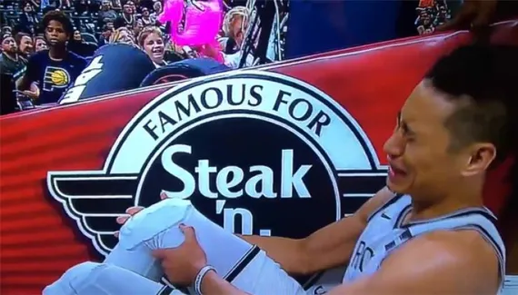 On était dans le 4e quart-temps du match face aux Pacers, et sur un lay up anodin, et sans contact avec un défenseur, Jeremy Lin se tord le genou sur sa réception. Il s'arrête près du socle du panier, touche son genou. Il doit sentir qu'un truc cloche, et il s'écroule en larmes…