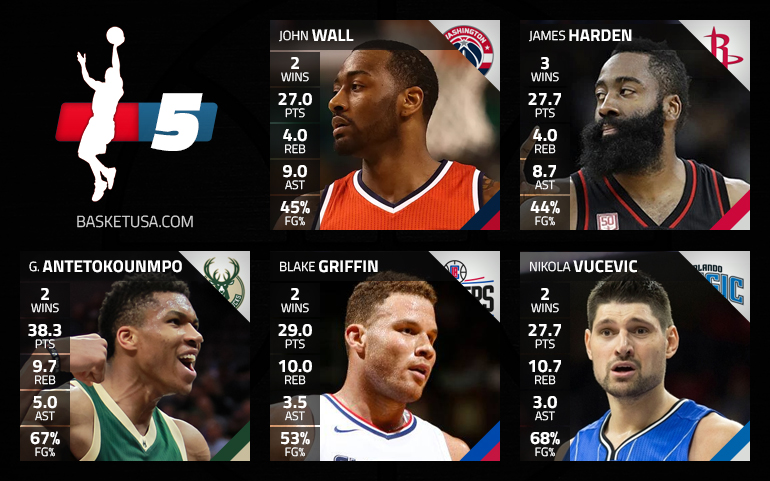 Et pour cette première semaine, on retrouve des têtes connues avec Giannis Antetokounmpo en tête d’affiche, le “Greek Freak” ayant impressionné, malgré une défaite face aux Cavaliers. À l’arrière, John Wall et James Harden mènent ainsi Washington et Houston et c’est finalement à l’intérieur que le choix fut plus délicat. Entre Blake Griffin, LaMarcus Aldridge, Marc Gasol ou encore Nikola Vucevic, ils sont quelques-uns à s’être illustrés lors de ce début de campagne NBA.