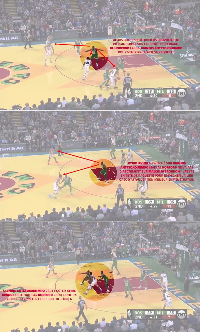 Le ballon ressort sur Giannis Antetokounmpo qui décide de travailler Kyrie Irving poste haut. Al Horford reste alors dans les parages, se montrant pour arrêter le dribble de son adversaire tout en gardant un oeil sur Malcolm Brogdon.