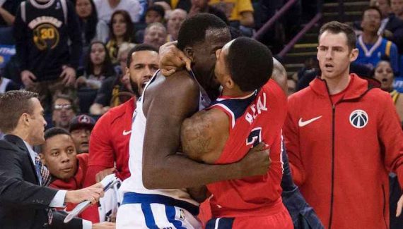 Il restait une poignée de secondes à jouer en première mi-temps quand soudain, la rencontre entre les Warriors et les Wizards s’est transformée en mêlée générale ! À l’origine de cette bagarre de chiffonniers, un accrochage au rebond entre Draymond Green et Bradley Beal. Le Wizard donne les premiers coups, Green réplique.