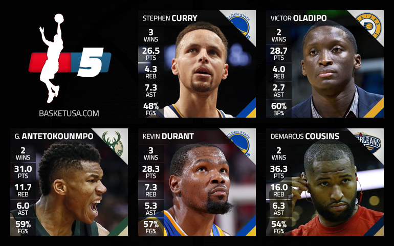 Cette semaine, deux incontournables avec un Giannis Antetokounmpo toujours monstrueux alors que DeMarcus Cousins n’a pas fait dans la dentelle pour son retour à Sacramento, et face à Cleveland, avec un triple double. Adroit et décisif face aux Spurs, Victor Oladipo s’invite également dans notre cinq majeur, aux côtés des deux monstres.