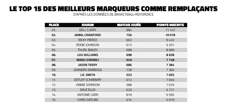 En effet, l'ancien triple meilleur sixième de la ligue affiche 10 018 points en tant que remplaçant, soit plus que ses 8 140 marqués du temps où il était titulaire. Clairement, il restera dans les mémoires comme un joker en sortie de banc.