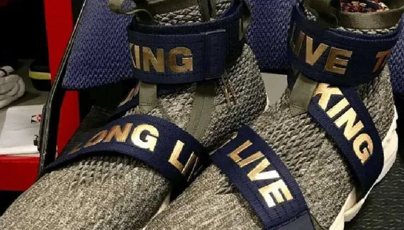 Le Flyknit recouvre toujours la tige, mais les lacets ont disparu, remplacés par une fermeture éclair sur l'intérieur du pied, et des sangles qui maintiennent l'ensemble, comme sur la Soldier 11. L'inscription joue la carte de la modestie : “Long live the King.”