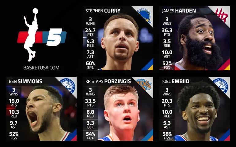 À leurs côtés, il y avait un bon paquet de candidats avec par exemple Damian Lillard, Devin Booker ou Kyrie Irving à l’extérieur, mais Stephen Curry a été d’une efficacité folle chez des Warriors qui montent en puissance et il a donc notre suffrage, Golden State ayant par ailleurs réussi une semaine parfaite avec trois succès. Kevin Durant aurait d’ailleurs pu l’accompagner sur l’aile, tout comme Andrew Wiggins avec un 4-0 des Wolves sur la période, mais la polyvalence de Ben Simmons nous a beaucoup impressionnés, avec trois victoires face à Houston, Atlanta et Indiana.