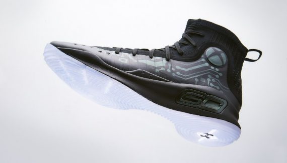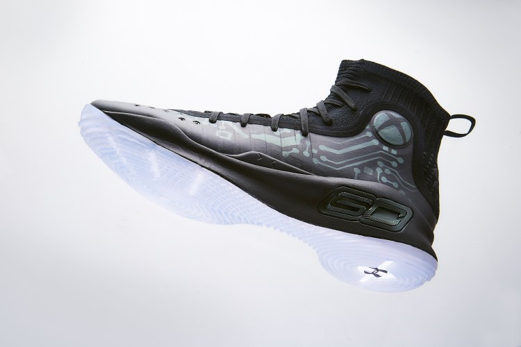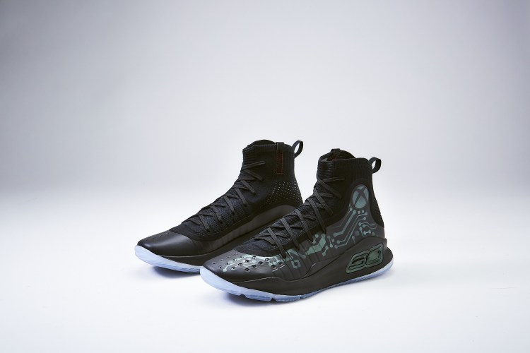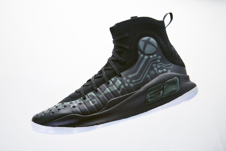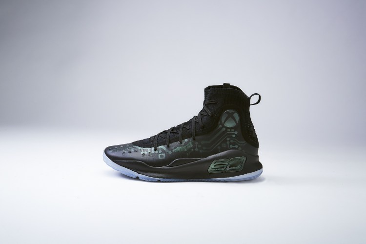 Under Armour et Microsoft se sont associés pour un pack exclusif réunissant la Curry 4 et la Xbox One X. Pour l’occasion, la chaussure est personnalisée par Mache Custom, avec une tige noire matte, et des circuits imprimés qui se baladent dessus. Le logo de la console est appliqué sur la malléole, avec une semelle translucide pour donner un peu de contraste et de luminosité. Dans une valise spéciale, quelques VIP ont reçu cette paire avec une Xbox One X assortie, sur laquelle on retrouve notamment le numéro 30 du joueur des Warriors.