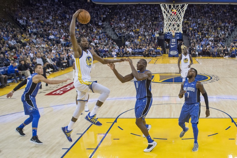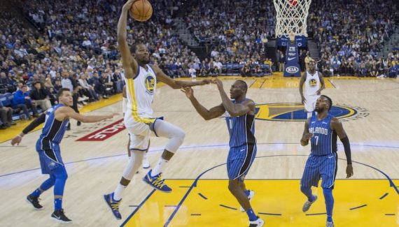Transparent en premier quart-temps, Klay Thompson se fait enfin remarquer en lançant un 9-2 qui permet aux Warriors de reprendre le contrôle de la rencontre, mais sept points de Terrence Ross ramène le Magic à leur hauteur (44-44). Alors qu’Aaron Gordon cherche à défier Kevin Durant depuis le début de match, il faut attendre la fin de la première mi-temps pour voir le MVP des dernières Finals lui répondre. Un gros contre, une leçon de un contre un et deux passes décisives plus tard, KD a frappé du poing sur la table, permettant aux Warriors de passer un 8-0.