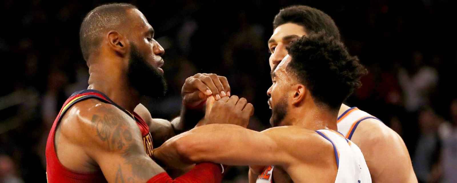 L’image était presque attendue dans le Knicks-Cavs de cette nuit. Dès le premier quart-temps, les trois acteurs impliqués dans “l’affaire Dennis Smith Jr.” – LeBron James, Enes Kanter, Frank Ntilikina – se retrouvent. Après un alley-oop, le King vient gêner le Français qui veut faire la remise en jeu. Ce dernier, pour le plus grand plaisir du Garden, repousse le quadruple MVP, qui lève les épaules l’air de rien.