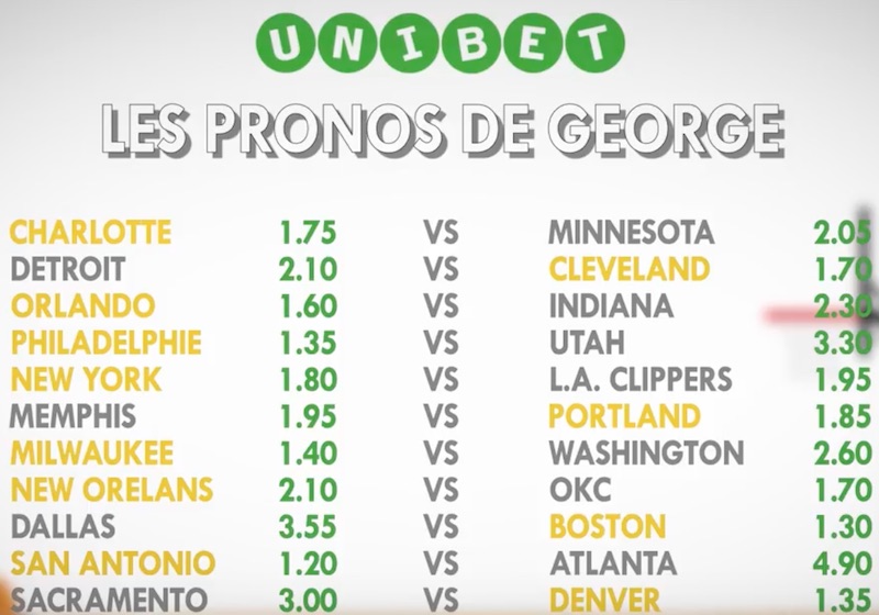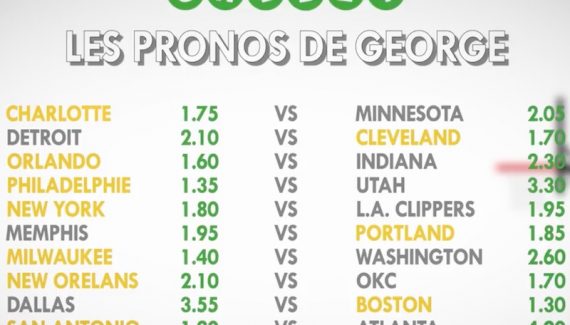 Voici la grille de George pour ce lundi, avec quelques belles cotes (New Orleans, Charlotte, Portland…), à vous de jouer pour faire mieux.