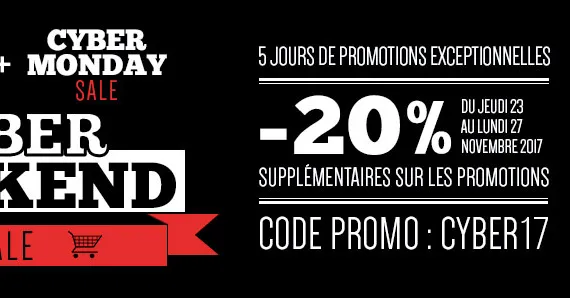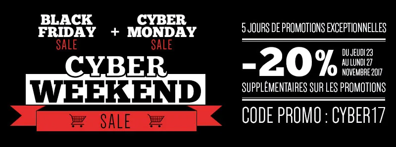 Comme chaque année en cette période de promotions du « Black Friday », notre partenaire vous propose de bénéficier de 20% de remise supplémentaire sur tous ses articles en promotion. Dès aujourd’hui et jusqu’à lundi minuit, ce sont plusieurs centaines d’articles, pour lesquels les prix peuvent déjà être remisés de 70%, qui verront encore leurs prix chuter avec le code « CYBER17 ».
