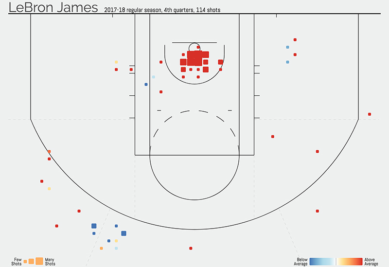 Et malgré un temps de jeu important, le Cavalier reste lucide dans le quatrième quart-temps avec 57% d’adresse aux tirs dont 37% à 3-points. Il convient à cet égard de rendre hommage à son arme secrète : le tir à 3-points à 45 degrès sur la gauche. Depuis le début de la saison, le King a rentré quatre de ses neuf tentatives depuis cette zone préférentielle en quatrième quart, zone dans laquelle il tournait déjà à 37% l’an passé.