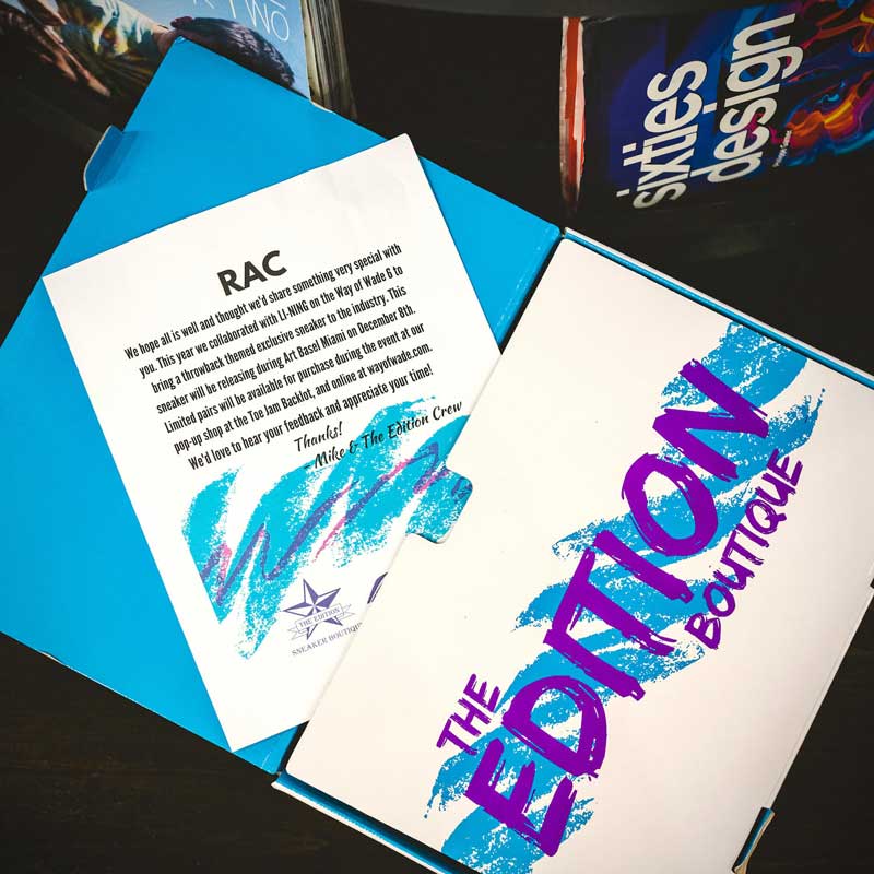 Le nom du magasin est inscrit de la même manière en énorme sous la semelle. Pour renforcer son caractère exclusif, ce coloris n’a été produit qu’à 500 paires numérotées, avec un packaging spécial. Pour acheter cette chaussure, il faudra se rendre sur un Pop-Up shop que The Edition animera les 8 et 9 décembre au Art Basel.